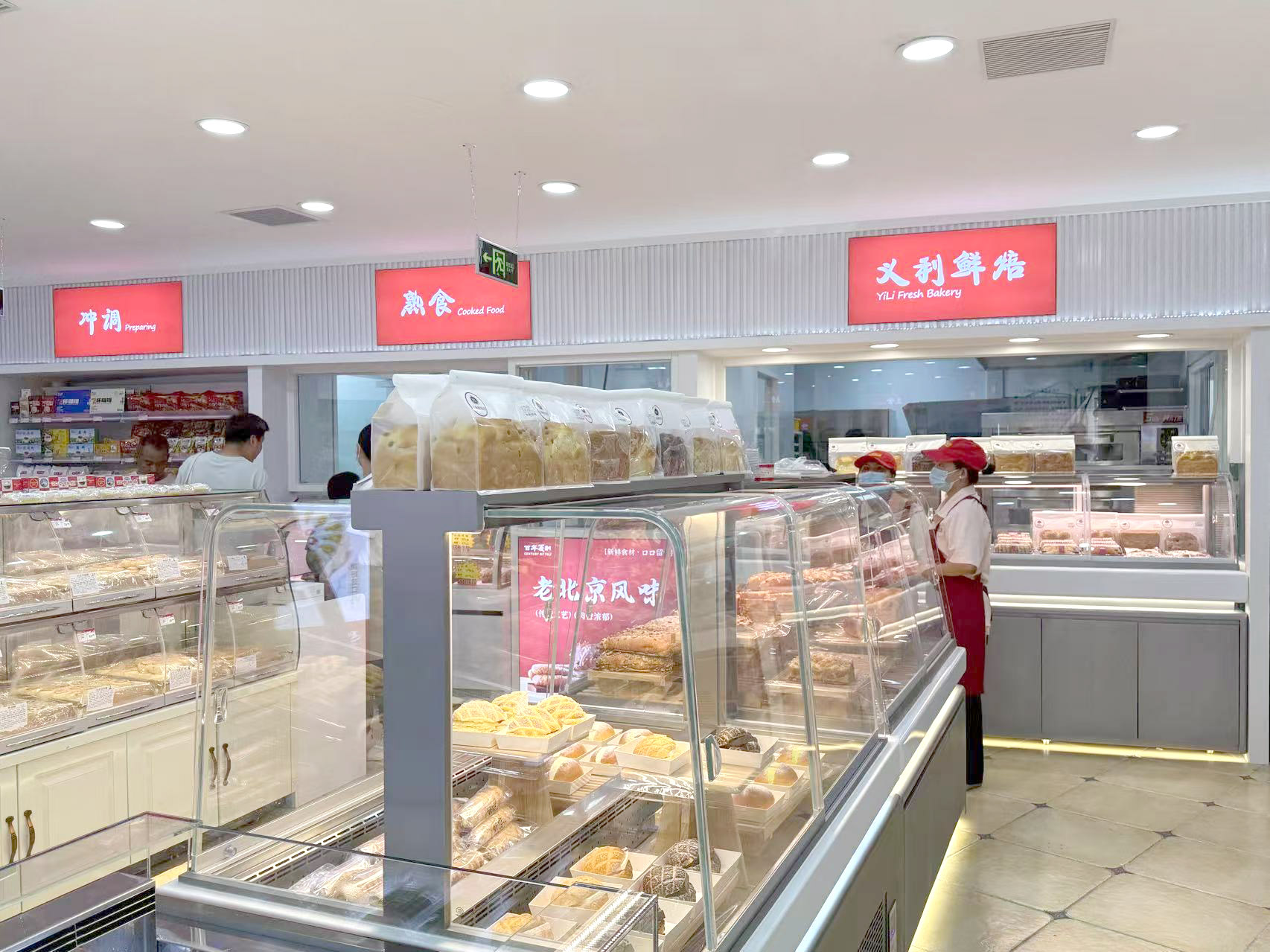烘焙区成为升级后的“重头戏”,C位出道助力老字号新品焕新机。门店根据不同时节产品需求,优化了产品陈列布局。除了义利果子面包,店里还有牛舌饼、桃酥、拿破仑蛋糕、老式黄油面包等经典老式糕点,特别增设现烤面包的鲜焙区和现打鲜奶、鲜啤,吸引年轻人的鲜食烘焙品琳琅满目,既有鲜奶吐司面包、奶贝蛋糕、老式蛋糕、黄油面包,也有“巨大的毛毛虫”“冰冰熊的最爱”等网红热品。不仅如此,门店还铺货更多短保质期的鲜食,如主打健康无添加的HPP(超高压灭菌技术)果汁,包括柑橘、苹果、桑葚、石榴、羽衣甘蓝等多种口味,以及鲜榨橘汁汽水等。